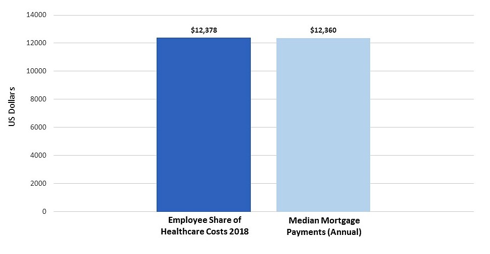 Figure 3. (A) Employees are now covering a bigger portion of healthcare costs than they have in the past (B) Healthcare costs for the average family were approximately the same as the median mortgage payment in the US